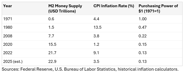 Debasement erodes the real value of money, reducing what individuals and institutions can buy with their currency holdings. For example, $1 in 1971 is equivalent to about $7.60 in 2025 dollars, reflecting a cumulative inflation of approximately 660%.