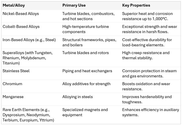 Combined-cycle natural gas power plants, often sited near AI hubs, use advanced superalloys to withstand extreme temperatures and ensure reliable, efficient baseload power. The following metals and alloys are essential to their operation: